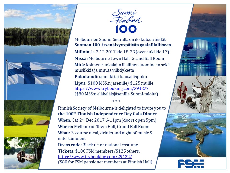 As we get closer to Finland’s Independence Day 6th December, the anniversary year culminates in special events around the world. There will be two events in Melbourne: first one is Finland 100 birthday party for kids on 26th November organised by the FSM Kids’ Club and Finland 100 Committee together with the Finnish School of Melbourne (see events). The second one is of course the Independence Day Gala Dinner at Melbourne Town Hall on 2nd December. Read more about these from our October newsletter as well about other upcoming events, AGM, Minister’s visit and baking days.
