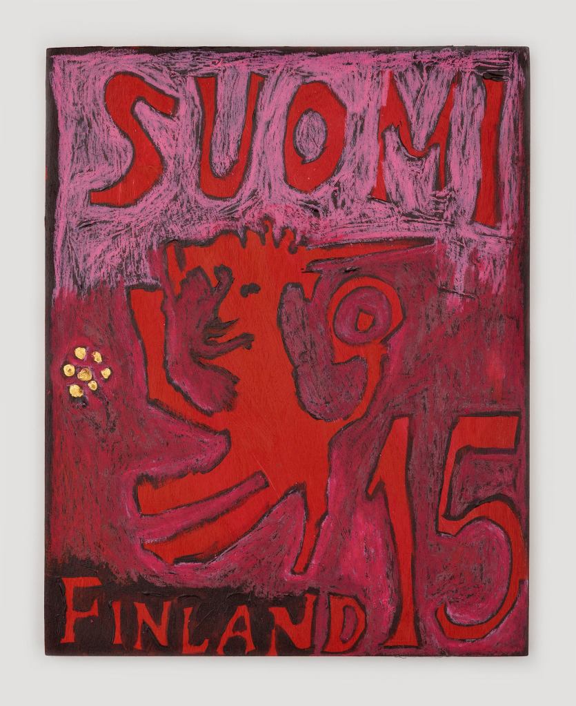 In some of her works, the artist has overlaid patterns from Finnish confectionary wrappers onto the Finnish coat of arms, screen-printed them onto fabric and applied them to the exterior of the costumes. The costumes are hand sewn, but pins remain, suggesting a national identity that is not fixed or stable. The psychological aspects of the work are further explored through a video of the artist as a solo figure who dances (or fights) in the absence of a partner (or adversary).